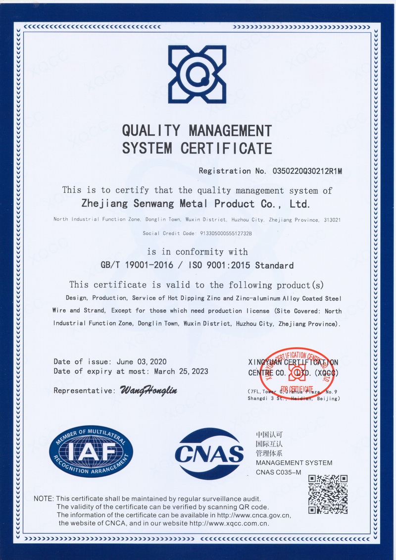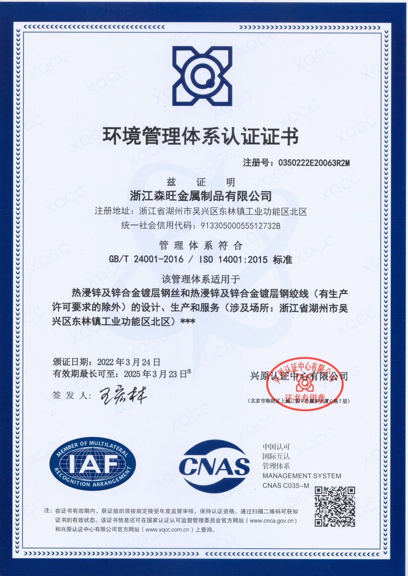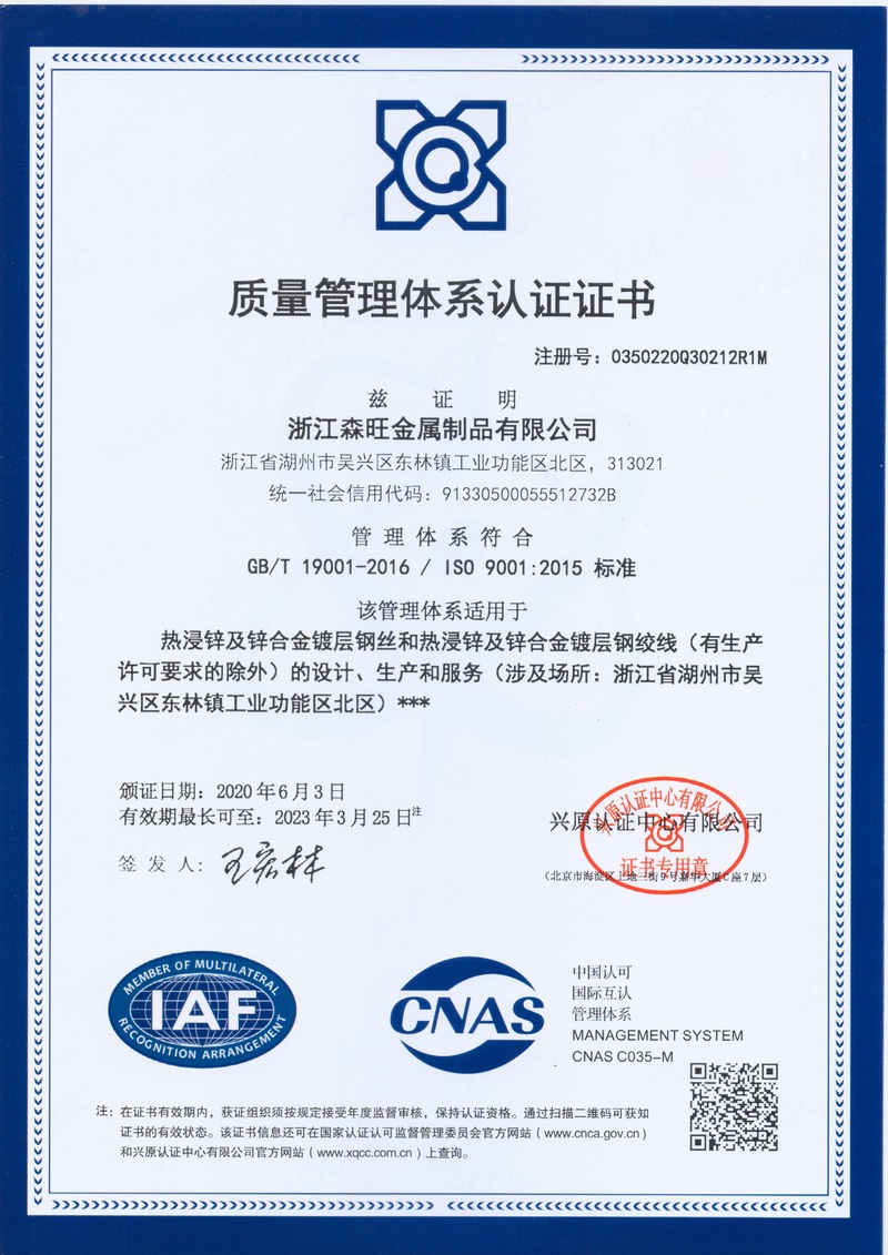 浙江森旺金屬制品有限公司成立于2012年,坐落湖州市吳興區(qū)東林鎮(zhèn)工業(yè)功能區(qū)。公司專業(yè)從事各類鍍鋅鋼絲、鋼絞線等產(chǎn)品的開發(fā)及生產(chǎn)。目前產(chǎn)品已廣泛應(yīng)用于各類通信光電纜,電力輸送,電氣化鐵路工程,各類堤壩防護(hù)及農(nóng)業(yè)溫室等工程領(lǐng)域。公司秉承“追求卓越品質(zhì),創(chuàng)建卓著信譽(yù)”的經(jīng)營理念,始終堅(jiān)持專業(yè)化、規(guī)模化的經(jīng)營模式。